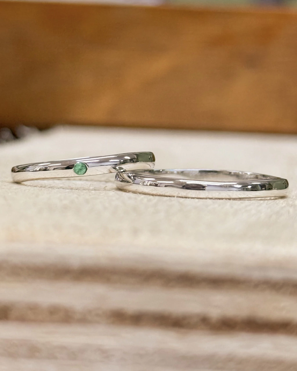 Modelo: Aliança slim feita à mão em prata 950 com design boleado cravejada com esmeralda natural e banho em Ouro18k branco